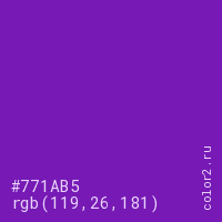Цвет #771AB5 в цветовой модели RGB обозначается тремя октетами (119, 26, 181) в десятичном формате и #771AB5 в шестнадцатиричном (hex) формате, которые являются интенсивностью красного 119 (hex 77), интенсивность зелёного 26 (hex 1A) и интенсивность синего 181 (hex B5).