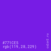 Цвет #771CE5 в цветовой модели RGB обозначается тремя октетами (119, 28, 229) в десятичном формате и #771CE5 в шестнадцатиричном (hex) формате, которые являются интенсивностью красного 119 (hex 77), интенсивность зелёного 28 (hex 1C) и интенсивность синего 229 (hex E5).