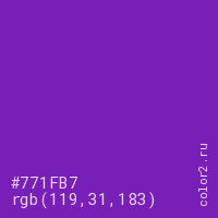 Цвет #771FB7 в цветовой модели RGB обозначается тремя октетами (119, 31, 183) в десятичном формате и #771FB7 в шестнадцатиричном (hex) формате, которые являются интенсивностью красного 119 (hex 77), интенсивность зелёного 31 (hex 1F) и интенсивность синего 183 (hex B7).