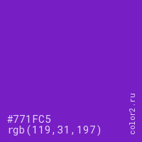 Цвет #771FC5 в цветовой модели RGB обозначается тремя октетами (119, 31, 197) в десятичном формате и #771FC5 в шестнадцатиричном (hex) формате, которые являются интенсивностью красного 119 (hex 77), интенсивность зелёного 31 (hex 1F) и интенсивность синего 197 (hex C5).
