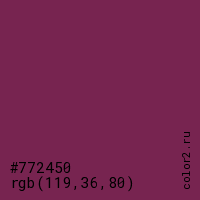 Цвет #772450 в цветовой модели RGB обозначается тремя октетами (119, 36, 80) в десятичном формате и #772450 в шестнадцатиричном (hex) формате, которые являются интенсивностью красного 119 (hex 77), интенсивность зелёного 36 (hex 24) и интенсивность синего 80 (hex 50).