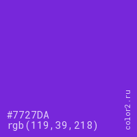 Цвет #7727DA в цветовой модели RGB обозначается тремя октетами (119, 39, 218) в десятичном формате и #7727DA в шестнадцатиричном (hex) формате, которые являются интенсивностью красного 119 (hex 77), интенсивность зелёного 39 (hex 27) и интенсивность синего 218 (hex DA).