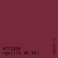 Цвет #77283B в цветовой модели RGB обозначается тремя октетами (119, 40, 59) в десятичном формате и #77283B в шестнадцатиричном (hex) формате, которые являются интенсивностью красного 119 (hex 77), интенсивность зелёного 40 (hex 28) и интенсивность синего 59 (hex 3B).