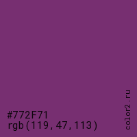 Цвет #772F71 в цветовой модели RGB обозначается тремя октетами (119, 47, 113) в десятичном формате и #772F71 в шестнадцатиричном (hex) формате, которые являются интенсивностью красного 119 (hex 77), интенсивность зелёного 47 (hex 2F) и интенсивность синего 113 (hex 71).