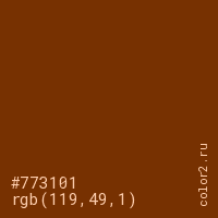 Цвет #773101 в цветовой модели RGB обозначается тремя октетами (119, 49, 1) в десятичном формате и #773101 в шестнадцатиричном (hex) формате, которые являются интенсивностью красного 119 (hex 77), интенсивность зелёного 49 (hex 31) и интенсивность синего 1 (hex 01).