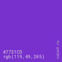 Цвет #7731CD в цветовой модели RGB обозначается тремя октетами (119, 49, 205) в десятичном формате и #7731CD в шестнадцатиричном (hex) формате, которые являются интенсивностью красного 119 (hex 77), интенсивность зелёного 49 (hex 31) и интенсивность синего 205 (hex CD).
