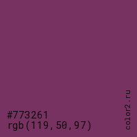Цвет #773261 в цветовой модели RGB обозначается тремя октетами (119, 50, 97) в десятичном формате и #773261 в шестнадцатиричном (hex) формате, которые являются интенсивностью красного 119 (hex 77), интенсивность зелёного 50 (hex 32) и интенсивность синего 97 (hex 61).