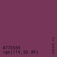 Цвет #773559 в цветовой модели RGB обозначается тремя октетами (119, 53, 89) в десятичном формате и #773559 в шестнадцатиричном (hex) формате, которые являются интенсивностью красного 119 (hex 77), интенсивность зелёного 53 (hex 35) и интенсивность синего 89 (hex 59).