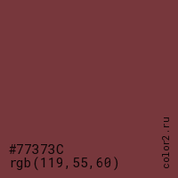 Цвет #77373C в цветовой модели RGB обозначается тремя октетами (119, 55, 60) в десятичном формате и #77373C в шестнадцатиричном (hex) формате, которые являются интенсивностью красного 119 (hex 77), интенсивность зелёного 55 (hex 37) и интенсивность синего 60 (hex 3C).