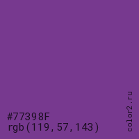 Цвет #77398F в цветовой модели RGB обозначается тремя октетами (119, 57, 143) в десятичном формате и #77398F в шестнадцатиричном (hex) формате, которые являются интенсивностью красного 119 (hex 77), интенсивность зелёного 57 (hex 39) и интенсивность синего 143 (hex 8F).