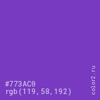 Цвет #773AC0 в цветовой модели RGB обозначается тремя октетами (119, 58, 192) в десятичном формате и #773AC0 в шестнадцатиричном (hex) формате, которые являются интенсивностью красного 119 (hex 77), интенсивность зелёного 58 (hex 3A) и интенсивность синего 192 (hex C0).