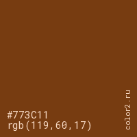 Цвет #773C11 в цветовой модели RGB обозначается тремя октетами (119, 60, 17) в десятичном формате и #773C11 в шестнадцатиричном (hex) формате, которые являются интенсивностью красного 119 (hex 77), интенсивность зелёного 60 (hex 3C) и интенсивность синего 17 (hex 11).