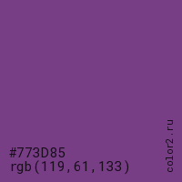 Цвет #773D85 в цветовой модели RGB обозначается тремя октетами (119, 61, 133) в десятичном формате и #773D85 в шестнадцатиричном (hex) формате, которые являются интенсивностью красного 119 (hex 77), интенсивность зелёного 61 (hex 3D) и интенсивность синего 133 (hex 85).