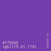 Цвет #773DAE в цветовой модели RGB обозначается тремя октетами (119, 61, 174) в десятичном формате и #773DAE в шестнадцатиричном (hex) формате, которые являются интенсивностью красного 119 (hex 77), интенсивность зелёного 61 (hex 3D) и интенсивность синего 174 (hex AE).