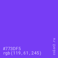 Цвет #773DF5 в цветовой модели RGB обозначается тремя октетами (119, 61, 245) в десятичном формате и #773DF5 в шестнадцатиричном (hex) формате, которые являются интенсивностью красного 119 (hex 77), интенсивность зелёного 61 (hex 3D) и интенсивность синего 245 (hex F5).