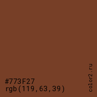 Цвет #773F27 в цветовой модели RGB обозначается тремя октетами (119, 63, 39) в десятичном формате и #773F27 в шестнадцатиричном (hex) формате, которые являются интенсивностью красного 119 (hex 77), интенсивность зелёного 63 (hex 3F) и интенсивность синего 39 (hex 27).