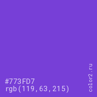 Цвет #773FD7 в цветовой модели RGB обозначается тремя октетами (119, 63, 215) в десятичном формате и #773FD7 в шестнадцатиричном (hex) формате, которые являются интенсивностью красного 119 (hex 77), интенсивность зелёного 63 (hex 3F) и интенсивность синего 215 (hex D7).