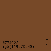 Цвет #774928 в цветовой модели RGB обозначается тремя октетами (119, 73, 40) в десятичном формате и #774928 в шестнадцатиричном (hex) формате, которые являются интенсивностью красного 119 (hex 77), интенсивность зелёного 73 (hex 49) и интенсивность синего 40 (hex 28).