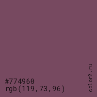 Цвет #774960 в цветовой модели RGB обозначается тремя октетами (119, 73, 96) в десятичном формате и #774960 в шестнадцатиричном (hex) формате, которые являются интенсивностью красного 119 (hex 77), интенсивность зелёного 73 (hex 49) и интенсивность синего 96 (hex 60).