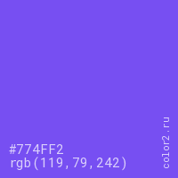 Цвет #774FF2 в цветовой модели RGB обозначается тремя октетами (119, 79, 242) в десятичном формате и #774FF2 в шестнадцатиричном (hex) формате, которые являются интенсивностью красного 119 (hex 77), интенсивность зелёного 79 (hex 4F) и интенсивность синего 242 (hex F2).