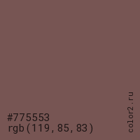 Цвет #775553 в цветовой модели RGB обозначается тремя октетами (119, 85, 83) в десятичном формате и #775553 в шестнадцатиричном (hex) формате, которые являются интенсивностью красного 119 (hex 77), интенсивность зелёного 85 (hex 55) и интенсивность синего 83 (hex 53).