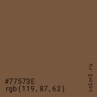Цвет #77573E в цветовой модели RGB обозначается тремя октетами (119, 87, 62) в десятичном формате и #77573E в шестнадцатиричном (hex) формате, которые являются интенсивностью красного 119 (hex 77), интенсивность зелёного 87 (hex 57) и интенсивность синего 62 (hex 3E).