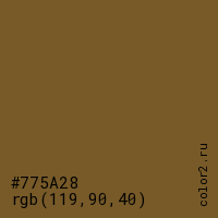 Цвет #775A28 в цветовой модели RGB обозначается тремя октетами (119, 90, 40) в десятичном формате и #775A28 в шестнадцатиричном (hex) формате, которые являются интенсивностью красного 119 (hex 77), интенсивность зелёного 90 (hex 5A) и интенсивность синего 40 (hex 28).