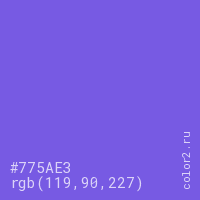 Цвет #775AE3 в цветовой модели RGB обозначается тремя октетами (119, 90, 227) в десятичном формате и #775AE3 в шестнадцатиричном (hex) формате, которые являются интенсивностью красного 119 (hex 77), интенсивность зелёного 90 (hex 5A) и интенсивность синего 227 (hex E3).