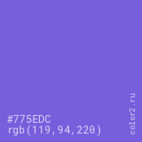 Цвет #775EDC в цветовой модели RGB обозначается тремя октетами (119, 94, 220) в десятичном формате и #775EDC в шестнадцатиричном (hex) формате, которые являются интенсивностью красного 119 (hex 77), интенсивность зелёного 94 (hex 5E) и интенсивность синего 220 (hex DC).