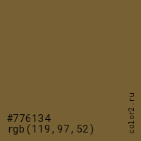 Цвет #776134 в цветовой модели RGB обозначается тремя октетами (119, 97, 52) в десятичном формате и #776134 в шестнадцатиричном (hex) формате, которые являются интенсивностью красного 119 (hex 77), интенсивность зелёного 97 (hex 61) и интенсивность синего 52 (hex 34).