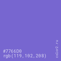 Цвет #7766D0 в цветовой модели RGB обозначается тремя октетами (119, 102, 208) в десятичном формате и #7766D0 в шестнадцатиричном (hex) формате, которые являются интенсивностью красного 119 (hex 77), интенсивность зелёного 102 (hex 66) и интенсивность синего 208 (hex D0).