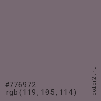 Цвет #776972 в цветовой модели RGB обозначается тремя октетами (119, 105, 114) в десятичном формате и #776972 в шестнадцатиричном (hex) формате, которые являются интенсивностью красного 119 (hex 77), интенсивность зелёного 105 (hex 69) и интенсивность синего 114 (hex 72).