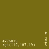 Цвет #776B13 в цветовой модели RGB обозначается тремя октетами (119, 107, 19) в десятичном формате и #776B13 в шестнадцатиричном (hex) формате, которые являются интенсивностью красного 119 (hex 77), интенсивность зелёного 107 (hex 6B) и интенсивность синего 19 (hex 13).