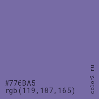 Цвет #776BA5 в цветовой модели RGB обозначается тремя октетами (119, 107, 165) в десятичном формате и #776BA5 в шестнадцатиричном (hex) формате, которые являются интенсивностью красного 119 (hex 77), интенсивность зелёного 107 (hex 6B) и интенсивность синего 165 (hex A5).