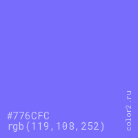 Цвет #776CFC в цветовой модели RGB обозначается тремя октетами (119, 108, 252) в десятичном формате и #776CFC в шестнадцатиричном (hex) формате, которые являются интенсивностью красного 119 (hex 77), интенсивность зелёного 108 (hex 6C) и интенсивность синего 252 (hex FC).