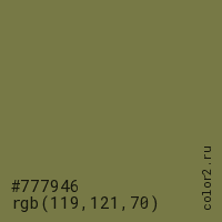 Цвет #777946 в цветовой модели RGB обозначается тремя октетами (119, 121, 70) в десятичном формате и #777946 в шестнадцатиричном (hex) формате, которые являются интенсивностью красного 119 (hex 77), интенсивность зелёного 121 (hex 79) и интенсивность синего 70 (hex 46).