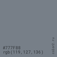 Цвет #777F88 в цветовой модели RGB обозначается тремя октетами (119, 127, 136) в десятичном формате и #777F88 в шестнадцатиричном (hex) формате, которые являются интенсивностью красного 119 (hex 77), интенсивность зелёного 127 (hex 7F) и интенсивность синего 136 (hex 88).