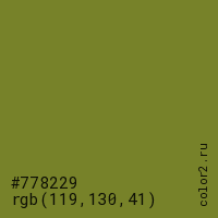 Цвет #778229 в цветовой модели RGB обозначается тремя октетами (119, 130, 41) в десятичном формате и #778229 в шестнадцатиричном (hex) формате, которые являются интенсивностью красного 119 (hex 77), интенсивность зелёного 130 (hex 82) и интенсивность синего 41 (hex 29).