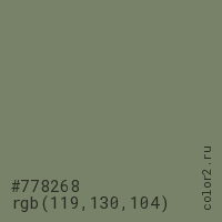 Цвет #778268 в цветовой модели RGB обозначается тремя октетами (119, 130, 104) в десятичном формате и #778268 в шестнадцатиричном (hex) формате, которые являются интенсивностью красного 119 (hex 77), интенсивность зелёного 130 (hex 82) и интенсивность синего 104 (hex 68).