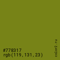 Цвет #778317 в цветовой модели RGB обозначается тремя октетами (119, 131, 23) в десятичном формате и #778317 в шестнадцатиричном (hex) формате, которые являются интенсивностью красного 119 (hex 77), интенсивность зелёного 131 (hex 83) и интенсивность синего 23 (hex 17).