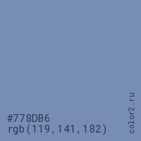 Цвет #778DB6 в цветовой модели RGB обозначается тремя октетами (119, 141, 182) в десятичном формате и #778DB6 в шестнадцатиричном (hex) формате, которые являются интенсивностью красного 119 (hex 77), интенсивность зелёного 141 (hex 8D) и интенсивность синего 182 (hex B6).