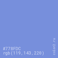 Цвет #778FDC в цветовой модели RGB обозначается тремя октетами (119, 143, 220) в десятичном формате и #778FDC в шестнадцатиричном (hex) формате, которые являются интенсивностью красного 119 (hex 77), интенсивность зелёного 143 (hex 8F) и интенсивность синего 220 (hex DC).