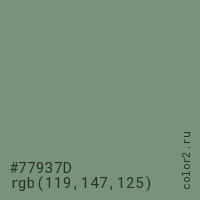 Цвет #77937D в цветовой модели RGB обозначается тремя октетами (119, 147, 125) в десятичном формате и #77937D в шестнадцатиричном (hex) формате, которые являются интенсивностью красного 119 (hex 77), интенсивность зелёного 147 (hex 93) и интенсивность синего 125 (hex 7D).