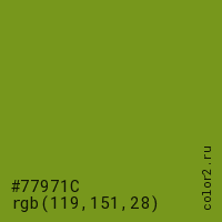 Цвет #77971C в цветовой модели RGB обозначается тремя октетами (119, 151, 28) в десятичном формате и #77971C в шестнадцатиричном (hex) формате, которые являются интенсивностью красного 119 (hex 77), интенсивность зелёного 151 (hex 97) и интенсивность синего 28 (hex 1C).