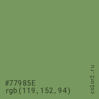 Цвет #77985E в цветовой модели RGB обозначается тремя октетами (119, 152, 94) в десятичном формате и #77985E в шестнадцатиричном (hex) формате, которые являются интенсивностью красного 119 (hex 77), интенсивность зелёного 152 (hex 98) и интенсивность синего 94 (hex 5E).