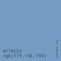 Цвет #779CC3 в цветовой модели RGB обозначается тремя октетами (119, 156, 195) в десятичном формате и #779CC3 в шестнадцатиричном (hex) формате, которые являются интенсивностью красного 119 (hex 77), интенсивность зелёного 156 (hex 9C) и интенсивность синего 195 (hex C3).