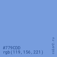 Цвет #779CDD в цветовой модели RGB обозначается тремя октетами (119, 156, 221) в десятичном формате и #779CDD в шестнадцатиричном (hex) формате, которые являются интенсивностью красного 119 (hex 77), интенсивность зелёного 156 (hex 9C) и интенсивность синего 221 (hex DD).
