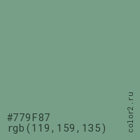 Цвет #779F87 в цветовой модели RGB обозначается тремя октетами (119, 159, 135) в десятичном формате и #779F87 в шестнадцатиричном (hex) формате, которые являются интенсивностью красного 119 (hex 77), интенсивность зелёного 159 (hex 9F) и интенсивность синего 135 (hex 87).