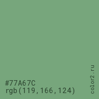 Цвет #77A67C в цветовой модели RGB обозначается тремя октетами (119, 166, 124) в десятичном формате и #77A67C в шестнадцатиричном (hex) формате, которые являются интенсивностью красного 119 (hex 77), интенсивность зелёного 166 (hex A6) и интенсивность синего 124 (hex 7C).