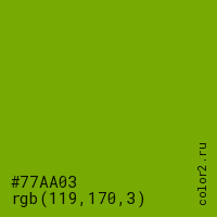 Цвет #77AA03 в цветовой модели RGB обозначается тремя октетами (119, 170, 3) в десятичном формате и #77AA03 в шестнадцатиричном (hex) формате, которые являются интенсивностью красного 119 (hex 77), интенсивность зелёного 170 (hex AA) и интенсивность синего 3 (hex 03).